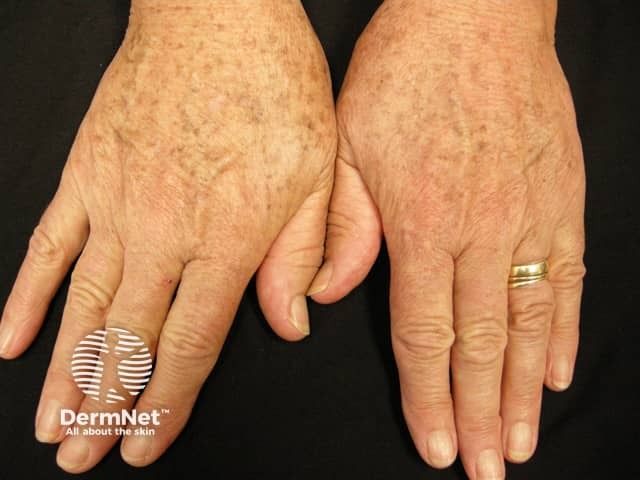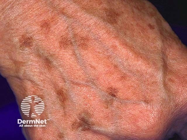 Solar lentigines, also called sun spots or age spots, are flat brown spots that show up on the skin after spending a lot of time in the sun. They are most common on areas like the face, hands, shoulders and arms where the sun hits most. These spots are not harmful but many people choose to treat them if they want their skin to look more even.